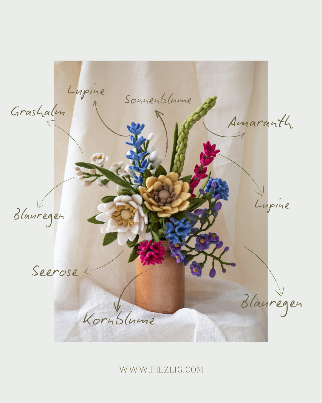 Die Blumensträuße aus Filz von Gry & Sif sind eine wunderschöne und langlebige Alternative zu echten Blumen. Diese handgefertigten Sträuße bestehen aus hochwertiger Schurwolle und bringen Farbe und Freude in jeden Raum. Ideal als Geschenk oder als dauerhafte Dekoration, sind sie perfekt für Allergiker und benötigen weder Wasser noch Licht.