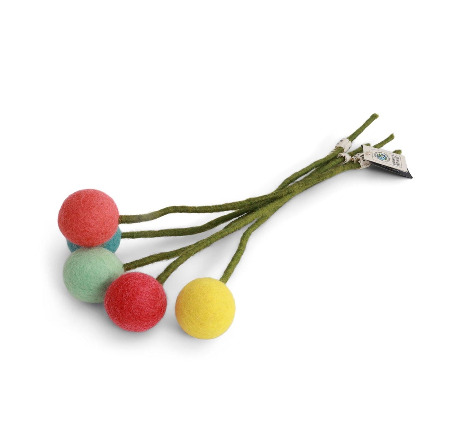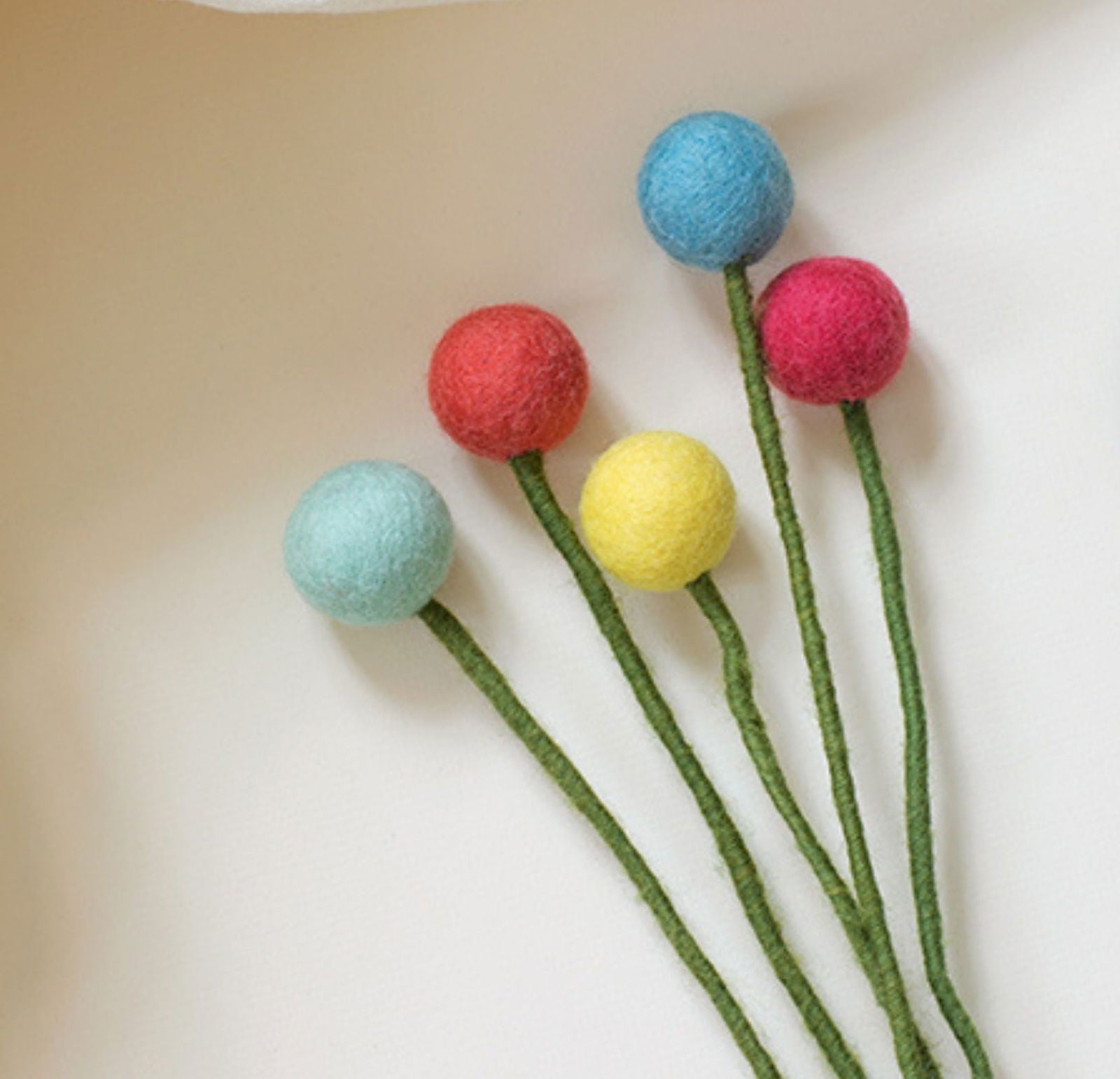 Der fröhliche Kugelblumen-Strauß von Gry & Sif besteht aus fünf handgefertigten Filzblumen in sanften Farben: Koralle, Eukalyptusgrün, Hellblau, Hellgelb und Melone.