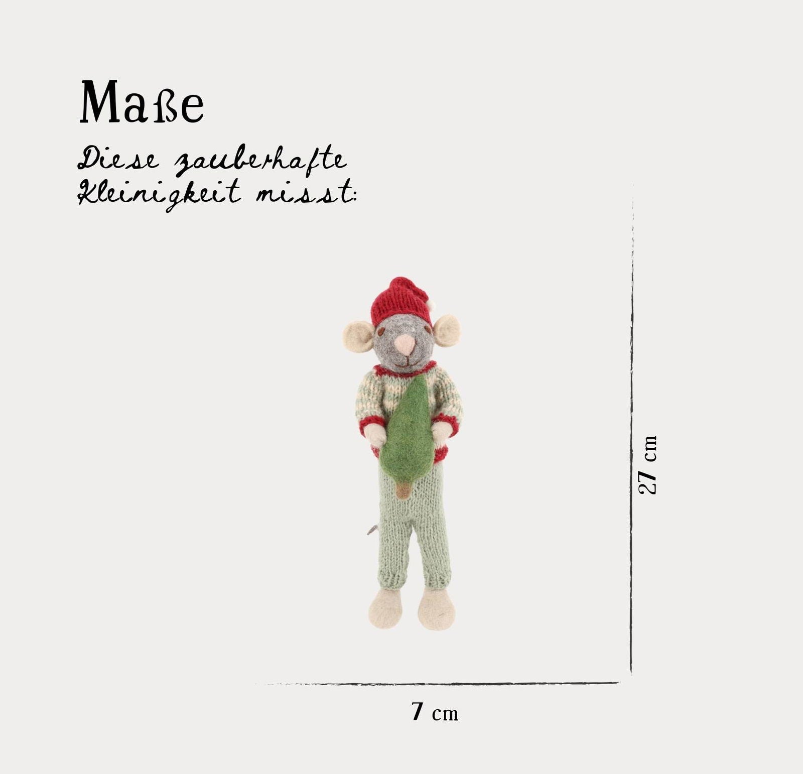 Diese große Filzmaus ist bereit für Weihnachten! Mit einem kleinen Weihnachtsbaum in der Hand und ihrem freundlichen Ausdruck bringt sie Charme und eine märchenhafte Stimmung in dein Zuhause. Ein festlicher Waldfreund, der unter dem Weihnachtsbaum stehen, auf der Fensterbank dekorieren oder im Adventskranz sitzen und ein Lächeln verbreiten kann.