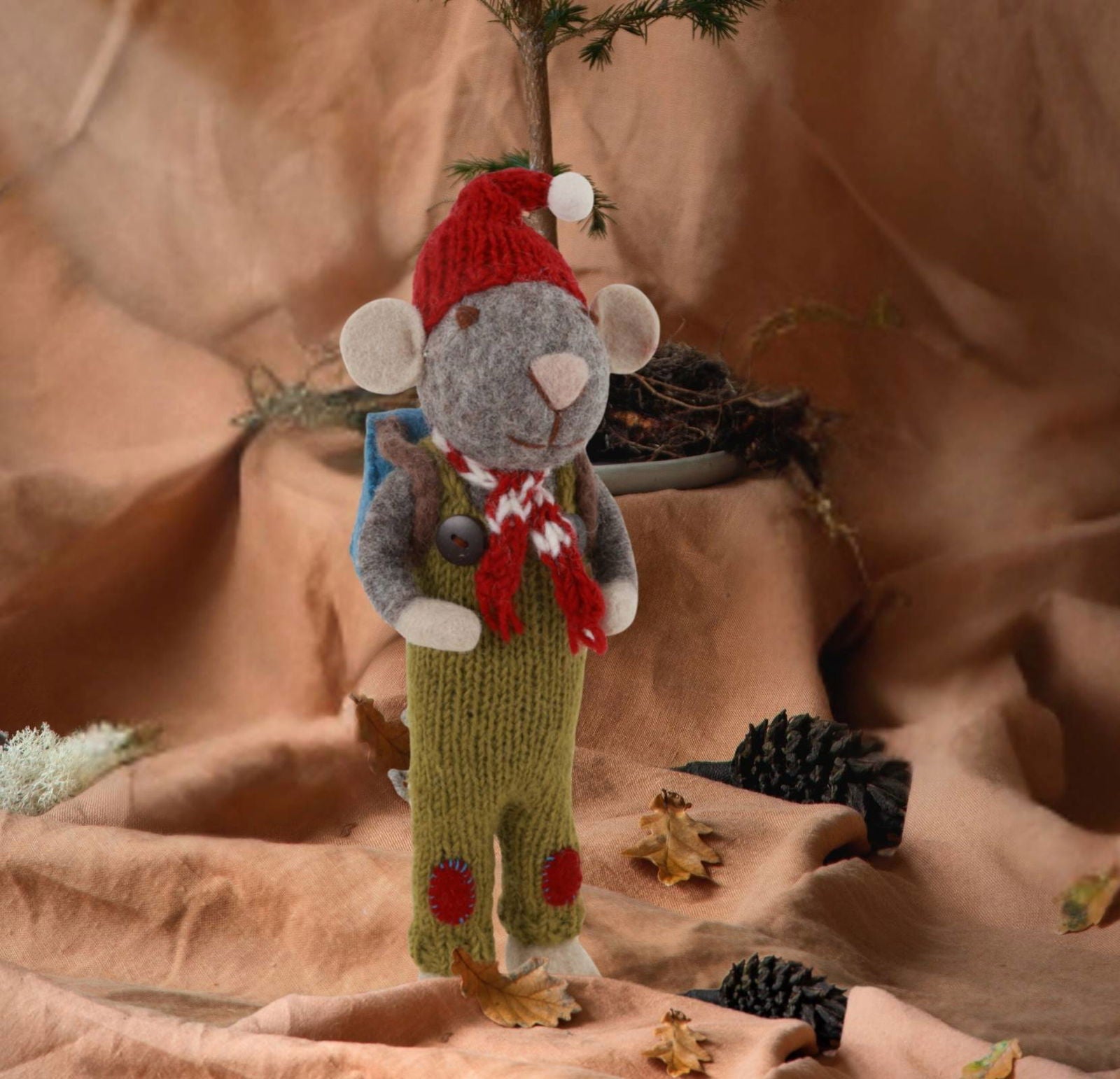 Ein niedlicher Weihnachtsfreund auf großer Reise – diese handgefertigte graue Filzmaus trägt eine grüne Hose und einen kleinen Rucksack, bereit für winterliche Abenteuer. Ob im Türkranz, auf dem Kaminsims oder als Deko auf dem Weihnachtstisch – sie bringt sofort Freude und weihnachtliche Stimmung.