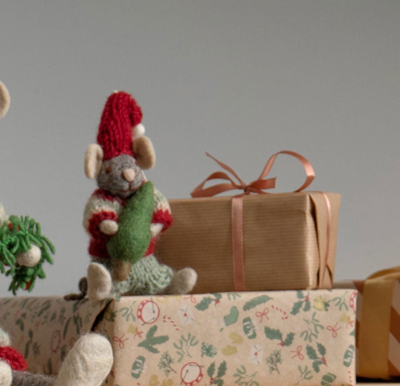 Diese graue Baby-Filzmaus hat ihren eigenen kleinen Weihnachtsbaum mitgebracht und ist bereit für das Fest. Mit vollem Arm und einem charmanten Lächeln bringt sie sofort Wärme und festliche Vorfreude in dein Zuhause – eine liebevoll-verspielte Ergänzung für jede Weihnachtslandschaft.