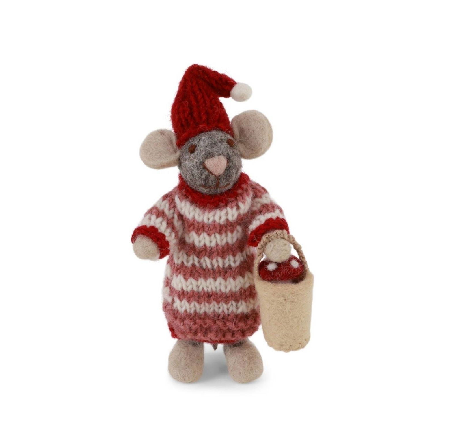Diese graue Baby-Filzmaus im Kleid trägt vorsichtig einen Pilz in ihrem kleinen Eimer – und bringt sofort eine märchenhafte Stimmung in dein Zuhause.
