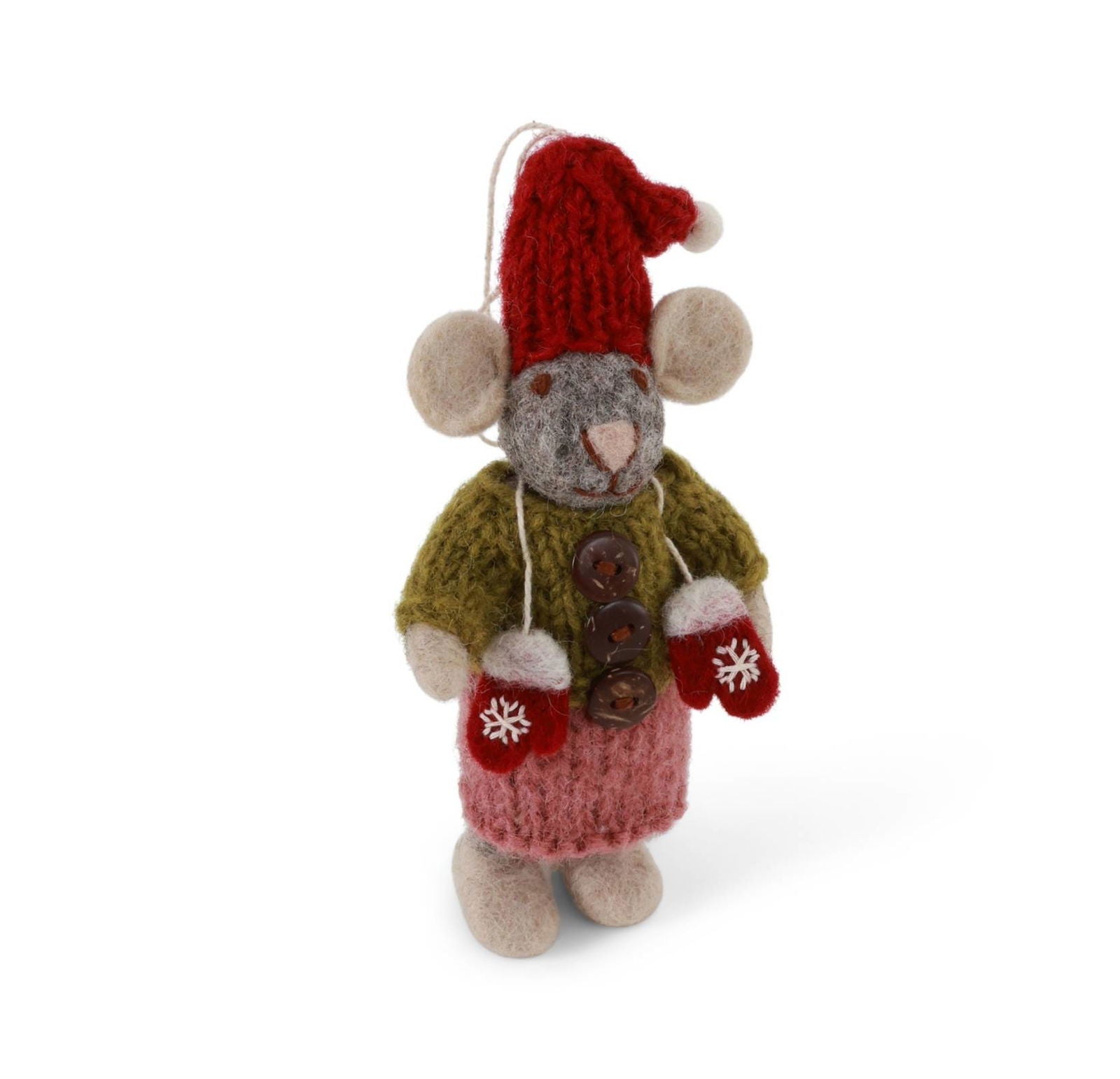 Diese kleine graue Babymus mit kuscheligen Fäustlingen und einem zarten Filzrock ist bereit für winterliche Abenteuer! Mit einer Höhe von 12 cm ist sie perfekt für deinen Weihnachtsbaum, als liebevolle Tischdeko oder als süßer Hingucker im Türkranz.