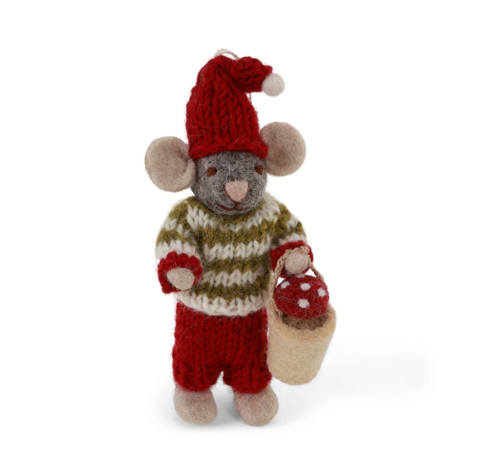 Eine kleine Weihnachtsmaus auf Pilzsuche im Wald. Diese graue Baby-Filzmaus im Kleid trägt vorsichtig einen Pilz in ihrem kleinen Eimer – und bringt sofort eine märchenhafte Stimmung in dein Zuhause.