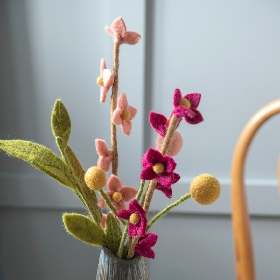 Die Blumensträuße aus Filz von Gry & Sif sind eine wunderschöne und langlebige Alternative zu echten Blumen. Diese handgefertigten Sträuße bestehen aus hochwertiger Schurwolle und bringen Farbe und Freude in jeden Raum. Ideal als Geschenk oder als dauerhafte Dekoration, sind sie perfekt für Allergiker und benötigen weder Wasser noch Licht.