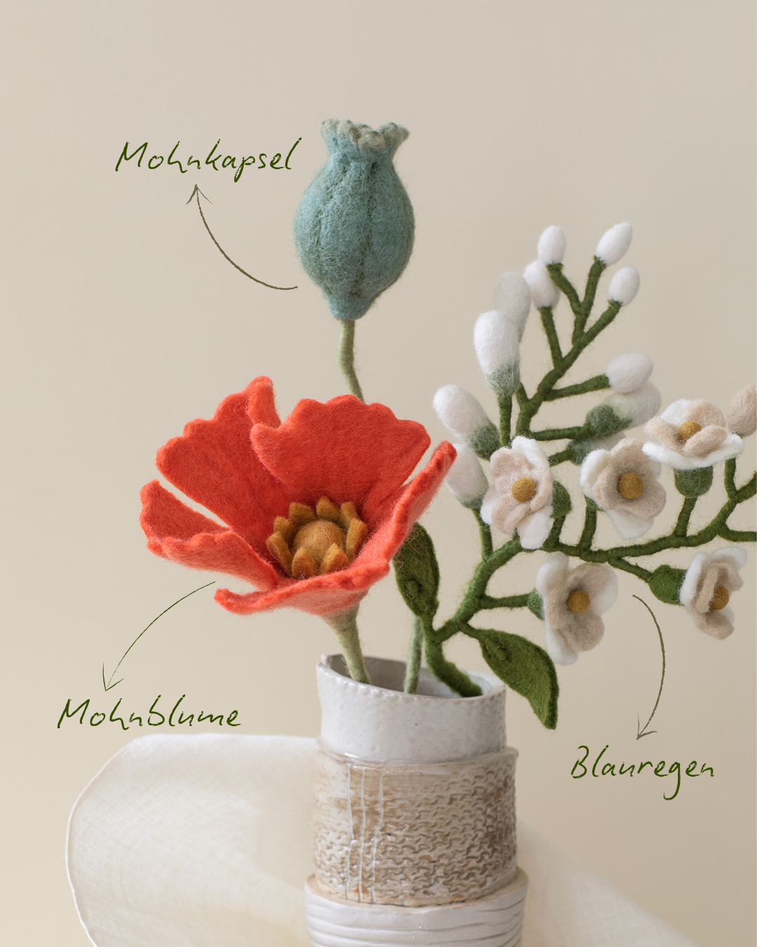 Die Blumensträuße aus Filz von Gry & Sif sind eine wunderschöne und langlebige Alternative zu echten Blumen. Diese handgefertigten Sträuße bestehen aus hochwertiger Schurwolle und bringen Farbe und Freude in jeden Raum. Ideal als Geschenk oder als dauerhafte Dekoration, sind sie perfekt für Allergiker und benötigen weder Wasser noch Licht.