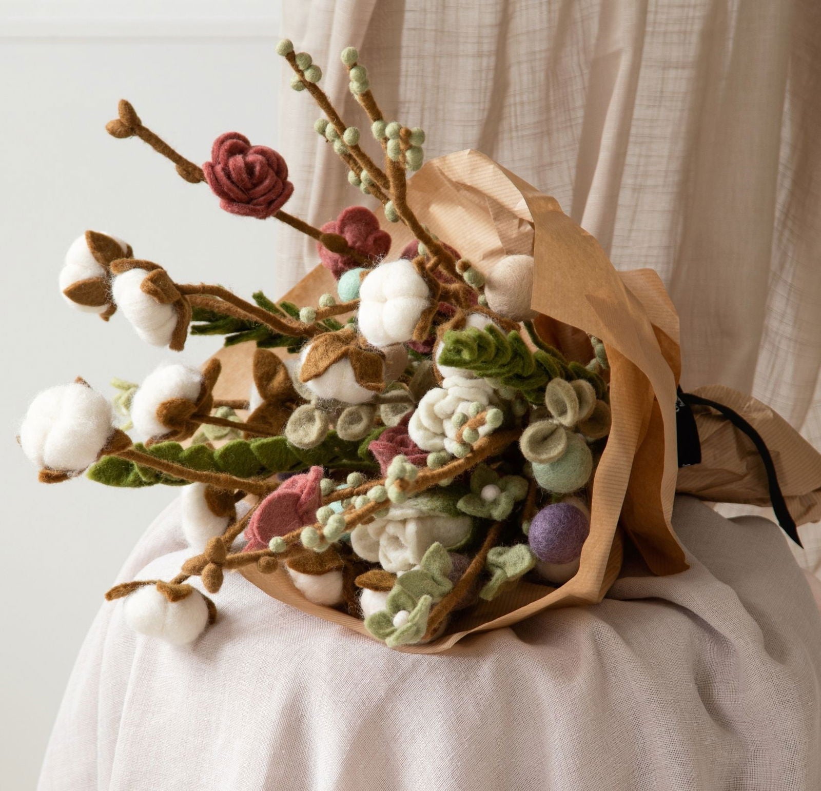 Die Blumensträuße aus Filz von Gry & Sif sind eine wunderschöne und langlebige Alternative zu echten Blumen. Diese handgefertigten Sträuße bestehen aus hochwertiger Schurwolle und bringen Farbe und Freude in jeden Raum. Ideal als Geschenk oder als dauerhafte Dekoration, sind sie perfekt für Allergiker und benötigen weder Wasser noch Licht.