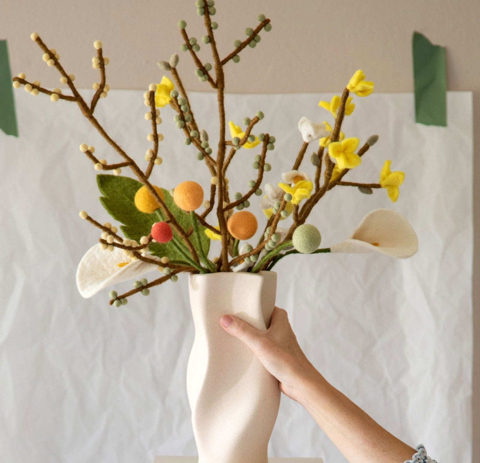 Die Blumensträuße aus Filz von Gry & Sif sind eine wunderschöne und langlebige Alternative zu echten Blumen. Diese handgefertigten Sträuße bestehen aus hochwertiger Schurwolle und bringen Farbe und Freude in jeden Raum. Ideal als Geschenk oder als dauerhafte Dekoration, sind sie perfekt für Allergiker und benötigen weder Wasser noch Licht.