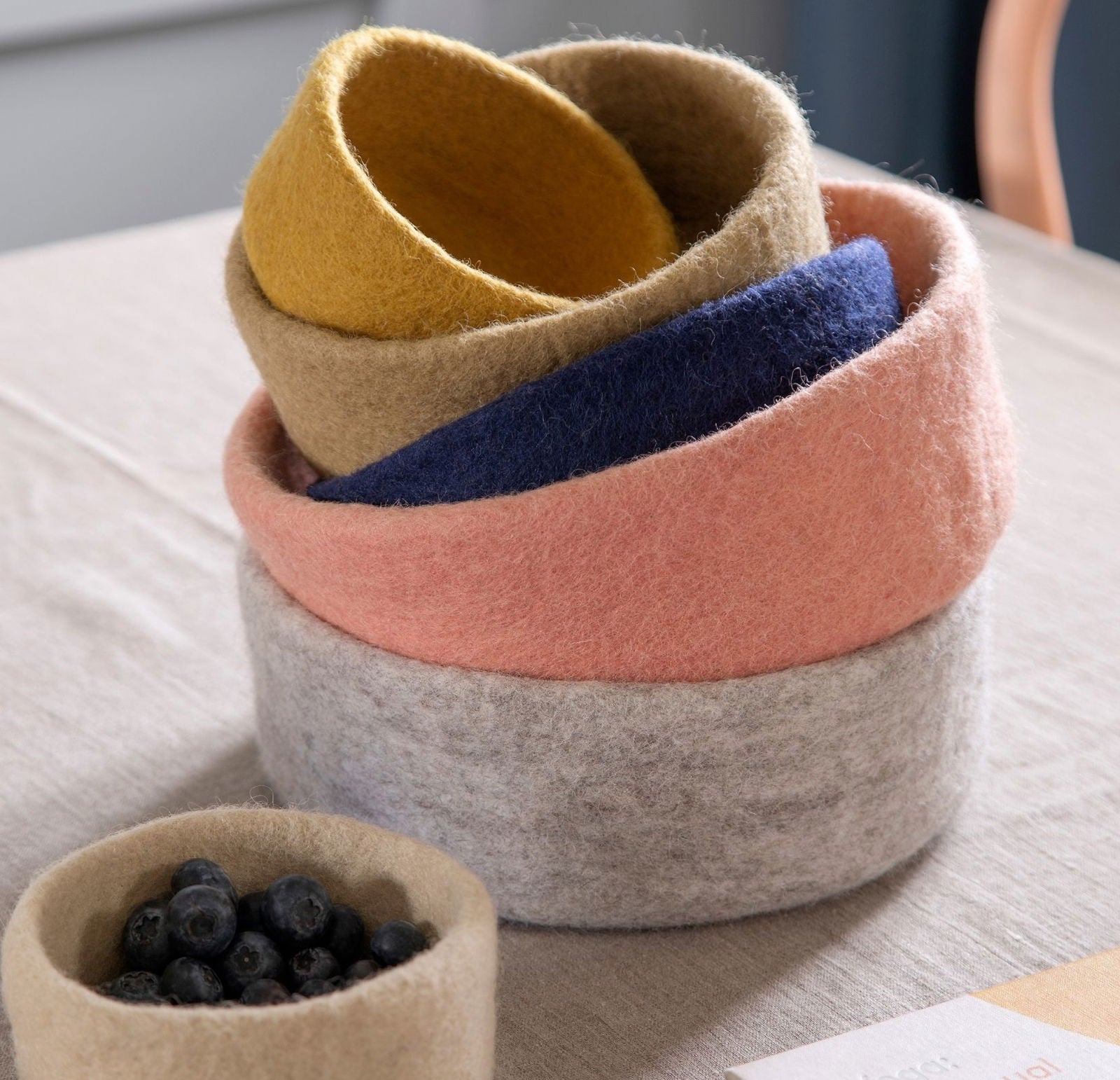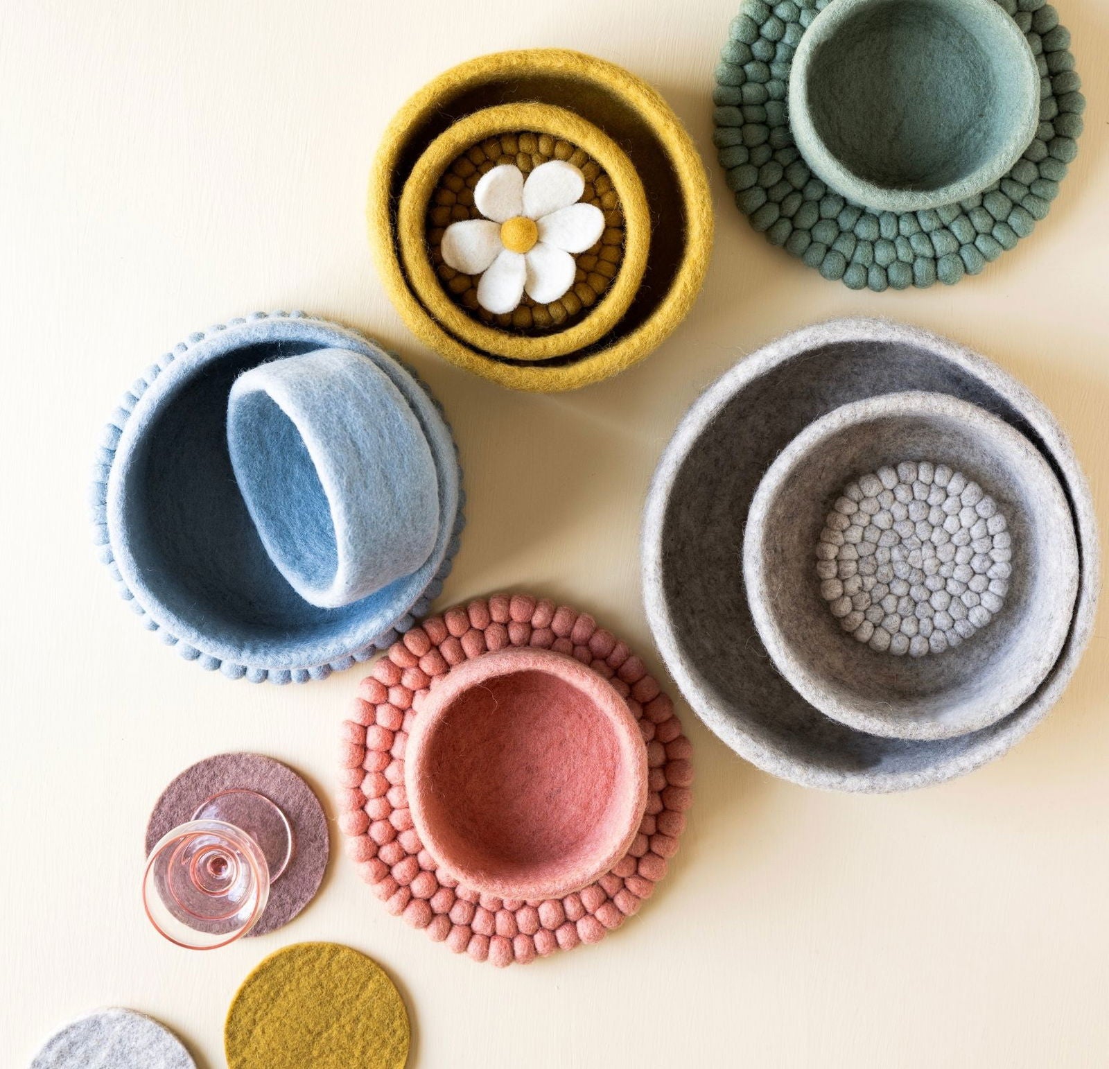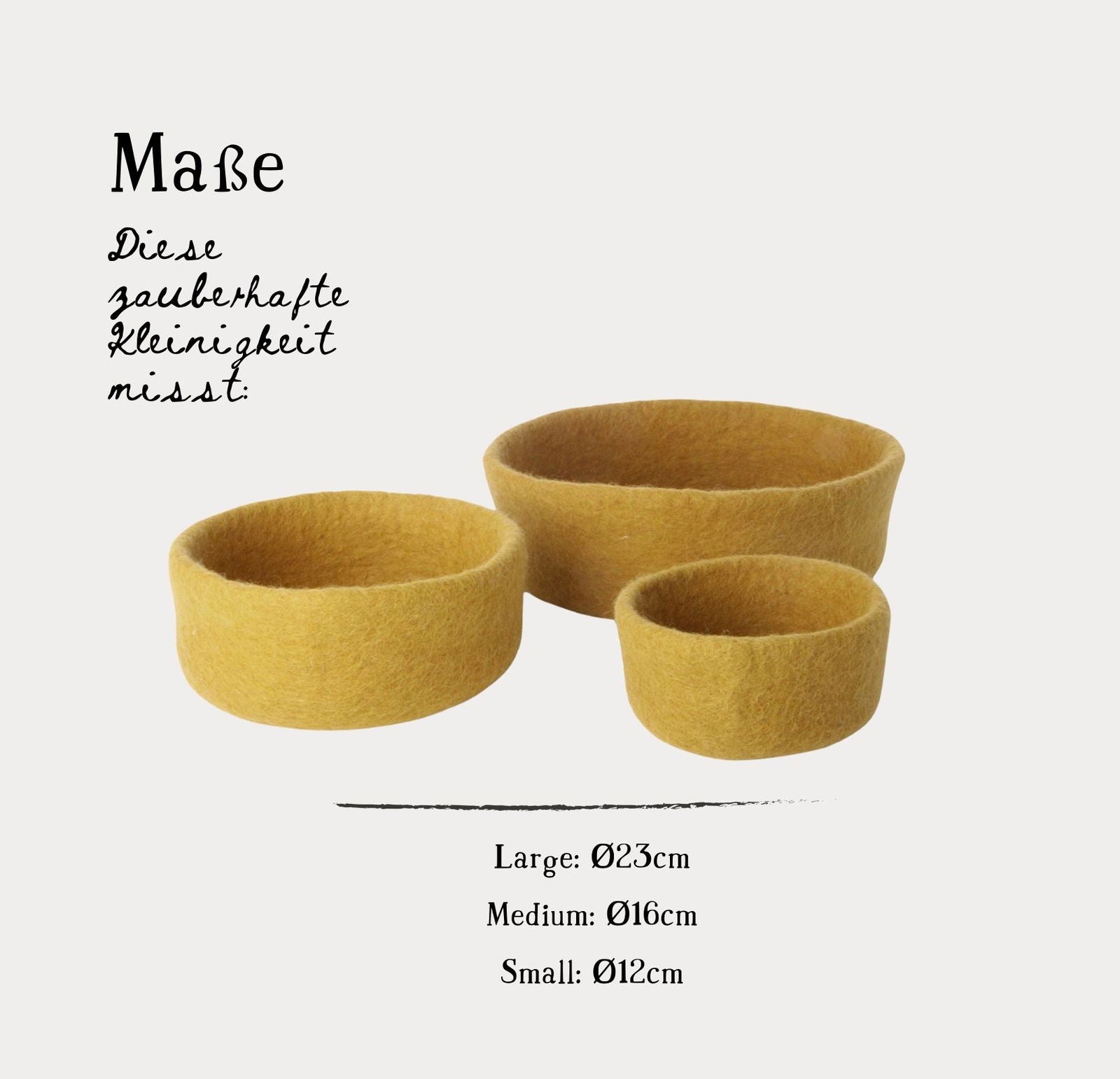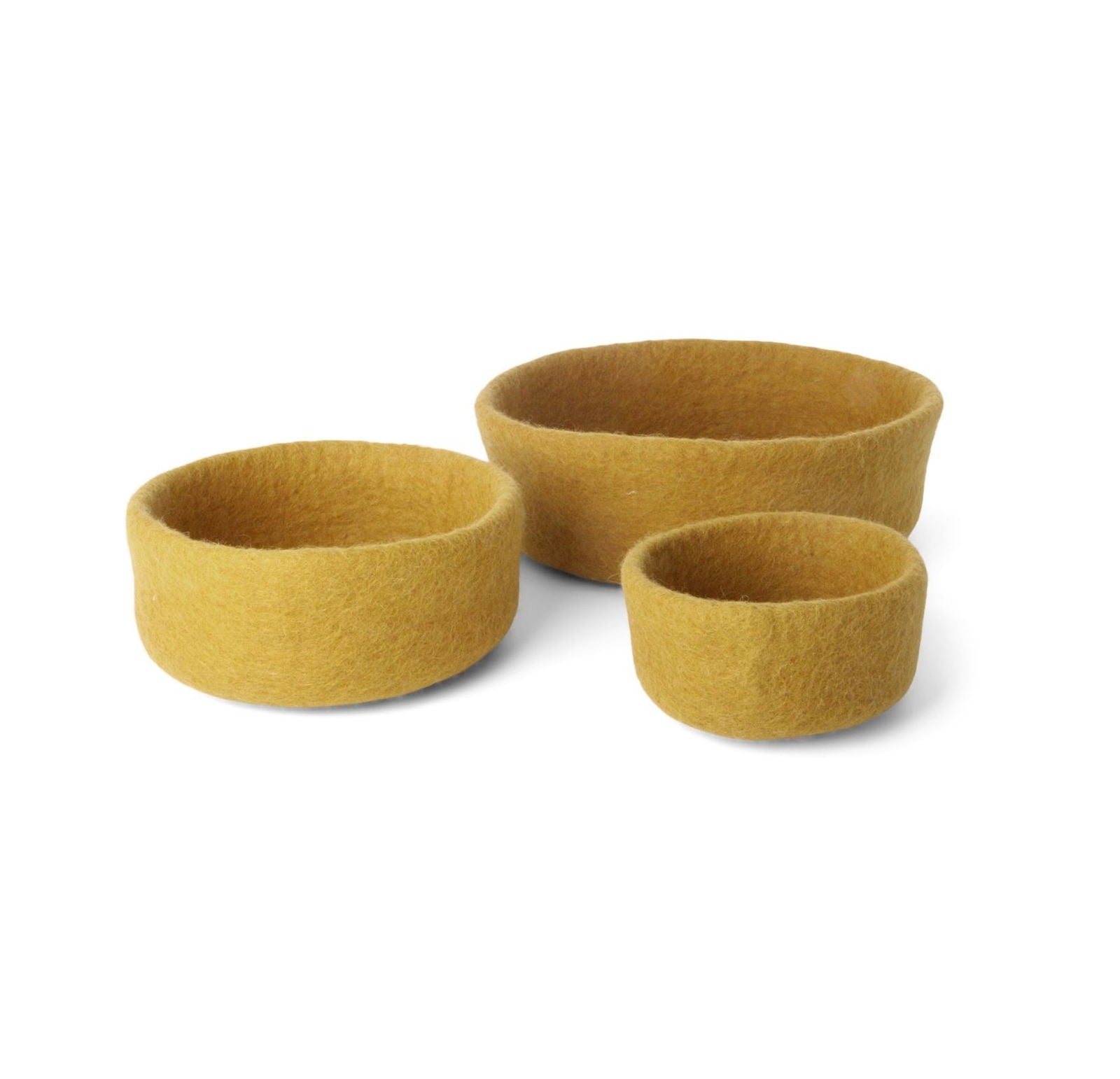 Dieses ockerfarbene Schalen-Set strahlt Wärme und Charme aus. Handgefertigt aus 100 % Wolle erzählt jedes Stück eine Geschichte nepalesischer Handwerkskunst und skandinavischer Schlichtheit