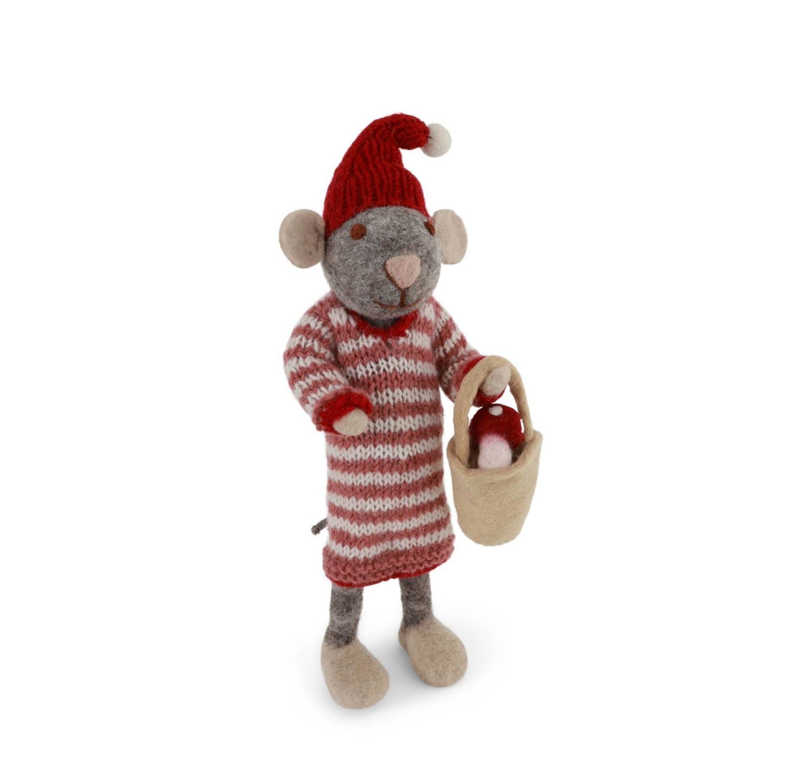 Filzfigur Maus grau groß mit Pilz im Eimer