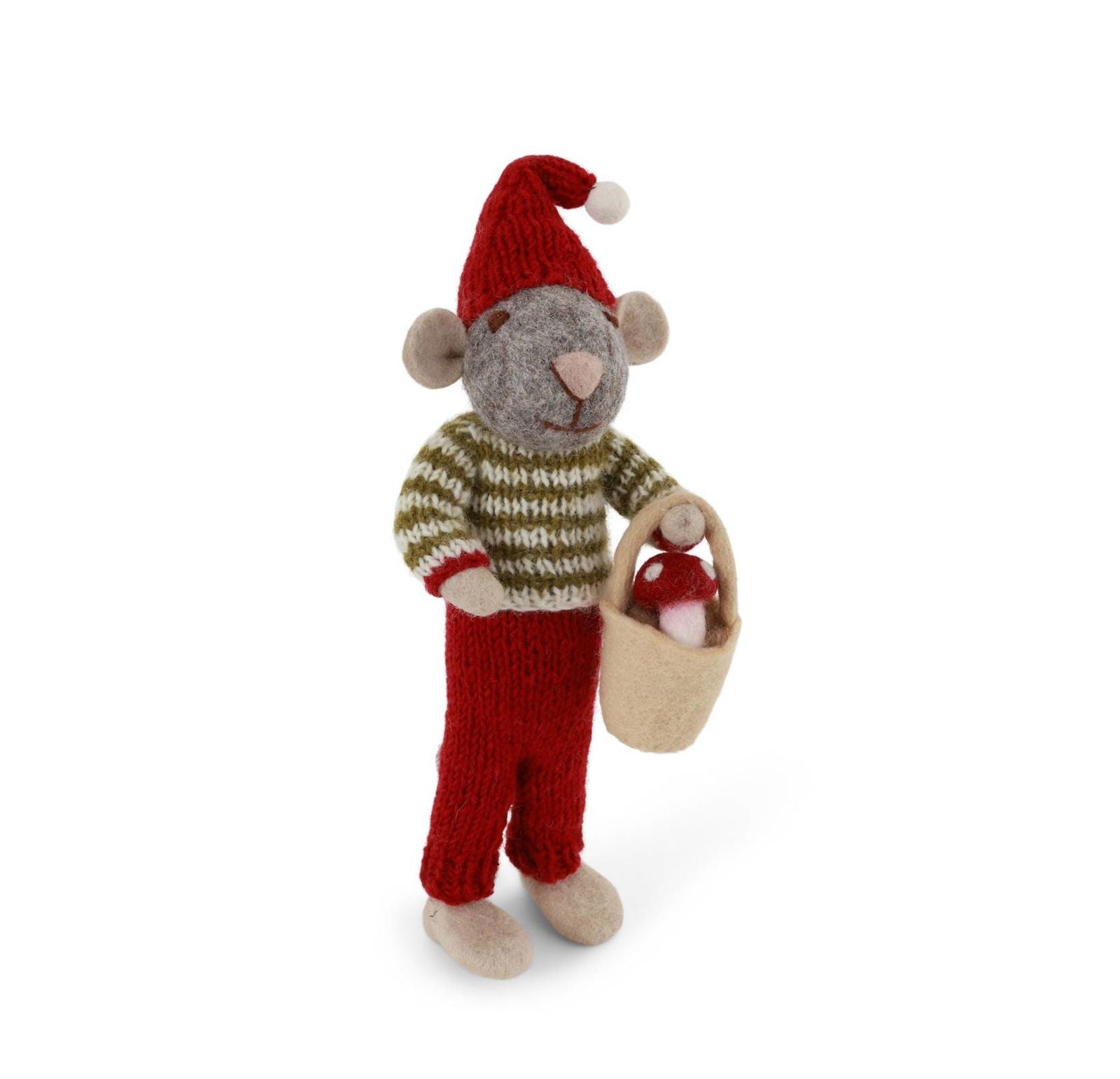 Diese rustikale Filzmaus bringt mit ihrem kleinen Eimer und dem liebevoll gefilzten Pilz einen Hauch von Waldmagie in deine Weihnachtsdeko. Ihre graue Farbe und das charmante Design machen sie zu einem ganz besonderen Blickfang – ob auf dem festlich gedeckten Tisch, im Adventskranz oder als herziger Anhänger am Baum.