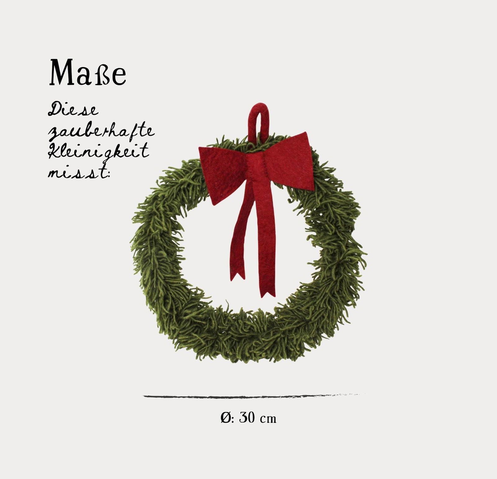 Ein wahres Weihnachts-Ikon! Dieser große, handgefilzte Türkranz mit schöner roter Schleife heißt die Weihnachtszeit mit Charme und Wärme willkommen. Hänge ihn an die Haustür, ins Entrée oder nutze ihn als festliches Centerpiece auf dem Tisch – der Kranz sorgt sofort für weihnachtliche Stimmung.