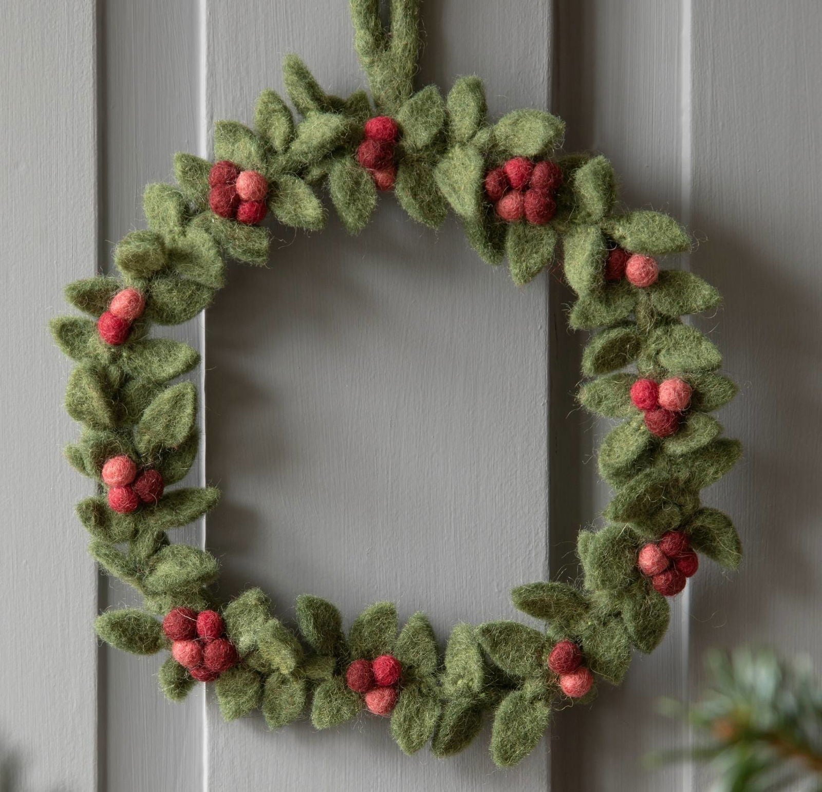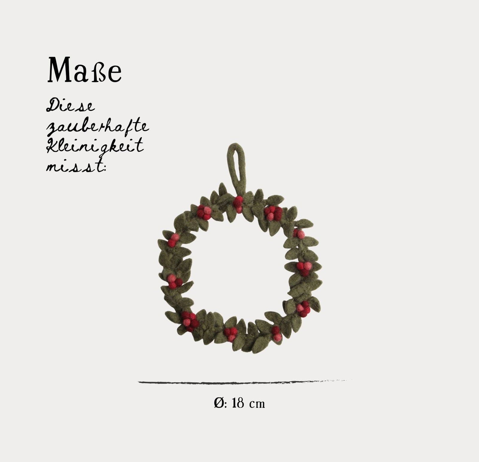 Dieser handgefilzte Türkranz in sattem Grün mit leuchtend roten Beeren ist ein festlicher Klassiker – im besten Sinne. Ob an der Haustür, im Fenster, als Tischdeko oder Teil eines Adventsarrangements: Der kleine Kranz bringt sofort weihnachtliche Stimmung in dein Zuhause.