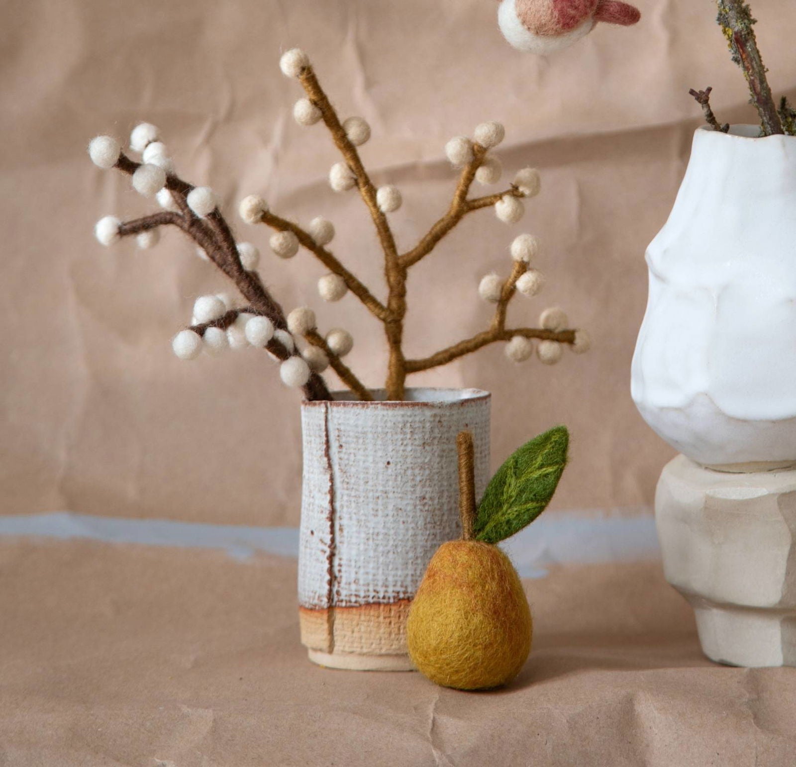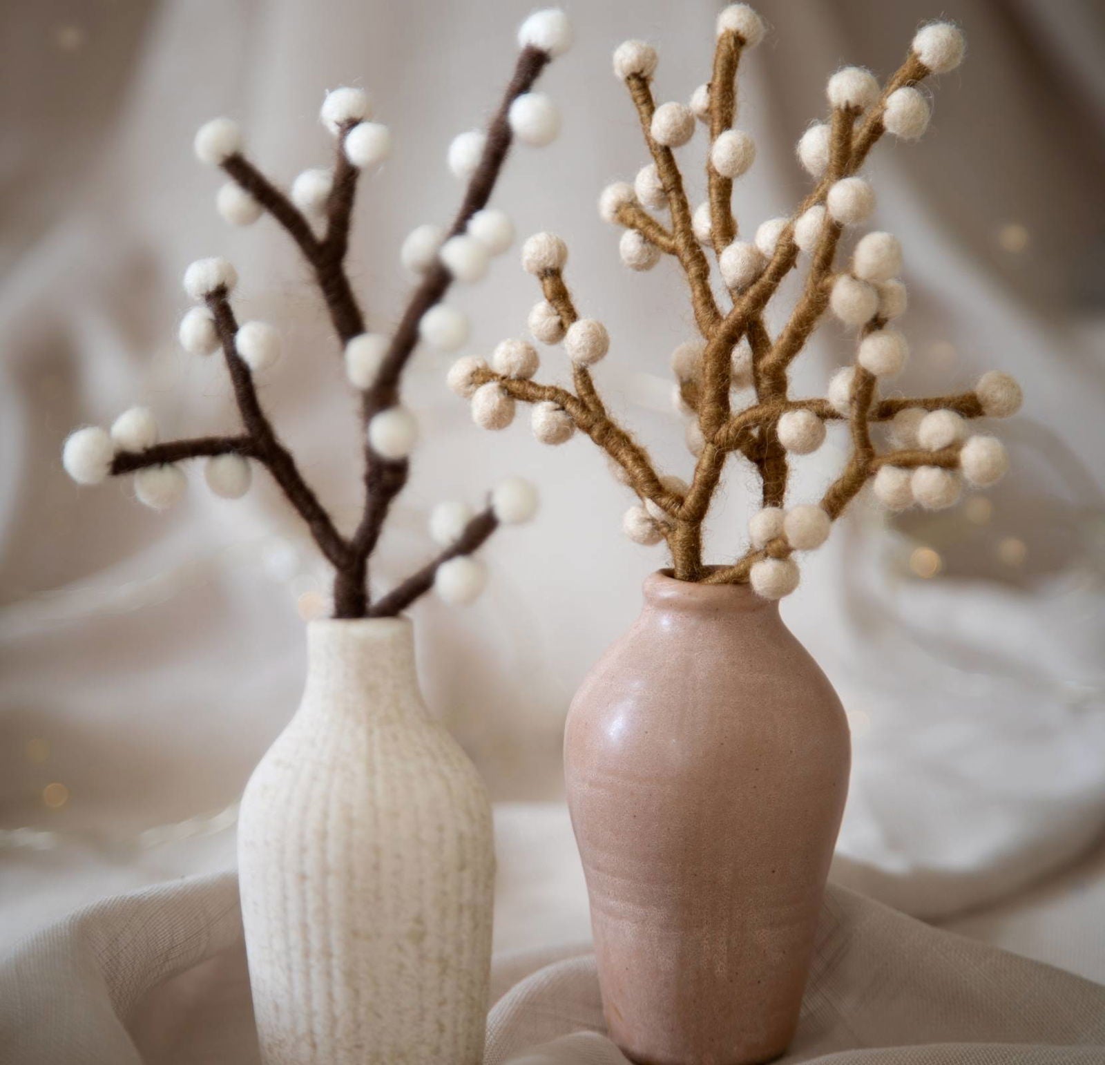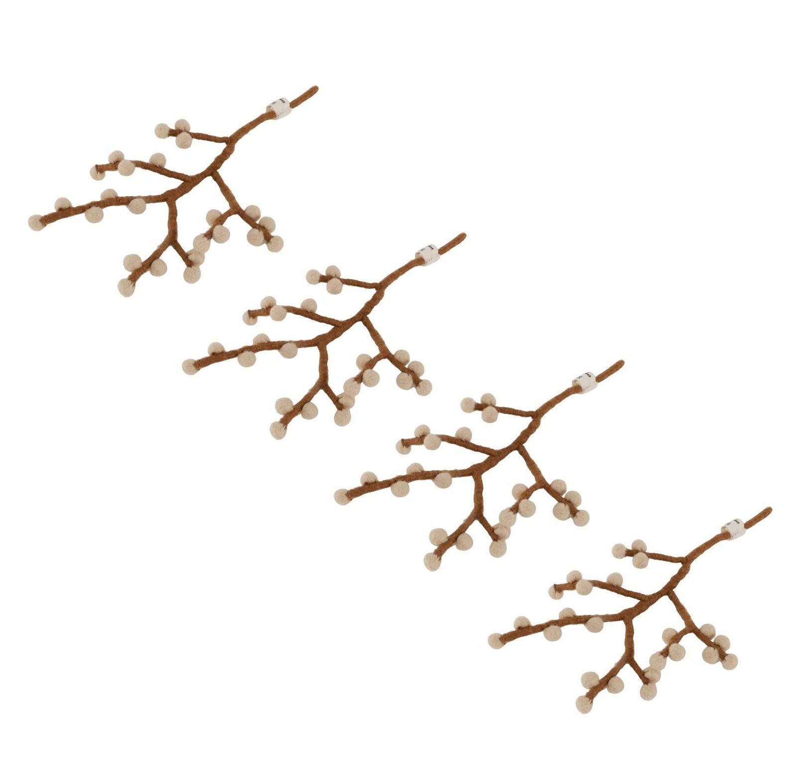 Vier handgefertigte Mini-Filzzweige mit zarten beigen Beeren – kleine Kunstwerke, die jedem Arrangement eine natürliche, elegante Note verleihen.