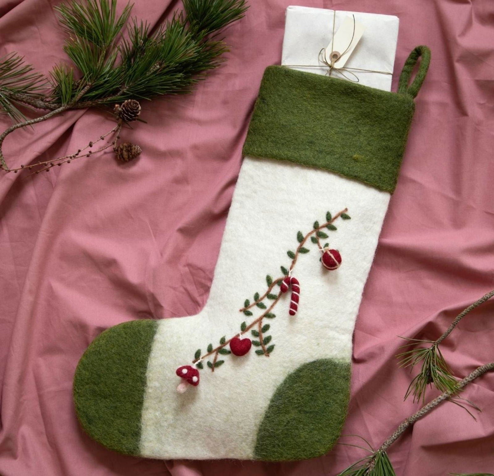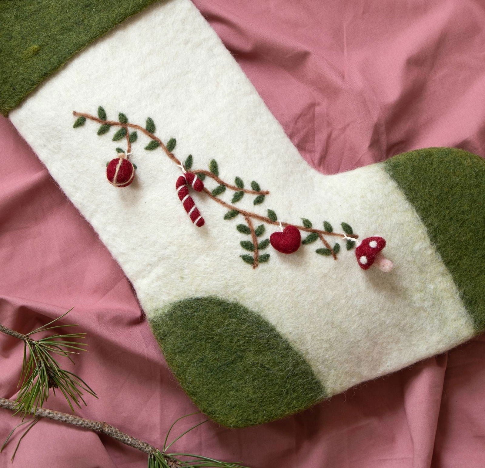 Dieser große handgefilzte Weihnachtsstrumpf in Weiß und Dunkelgrün ist mit einer zarten, festlichen Girlande aus Nadelfilz geschmückt. Mit seiner Höhe von 50 cm bietet er genug Platz für kleine Geschenke, Briefe, Leckereien oder eine liebevolle Überraschung – genau das Richtige für die schönste Zeit des Jahres.